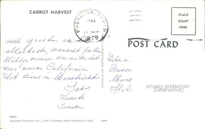 72434876 old postcard Pasadena California Karotten Ernte postalisch gelaufen Erhaltung siehe scans KatCode: 14140050000000