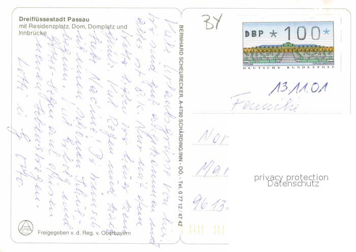 72693000 alte Postkarte PAssAU Bayern Dreifluessestadt Residenzplatz Dom Domplatz Innbruecke Fliegeraufnahme postalisch gelaufen Erhaltung siehe scans [FriedD77] KatCode: 11110009262000