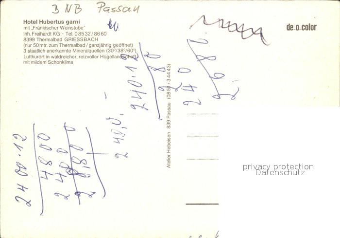 72227153 PAssAU Bayern Hotel Hubertus garni Griessbach postalisch nicht gelaufen Erhaltung siehe scans KatCode: 11110009262000