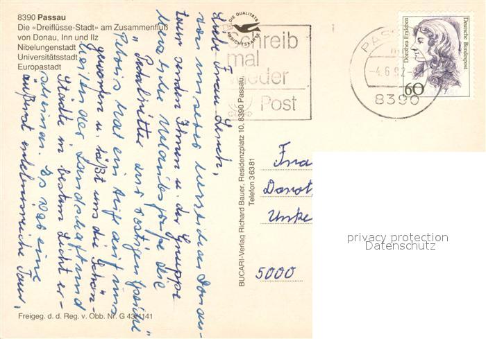 73636620 alte Postkarte Passau Fliegeraufnahme am Zusammenfluss von Donau Inn und Ilz postalisch gelaufen Erhaltung siehe scans [WerneD78] KatCode: 11110009262000