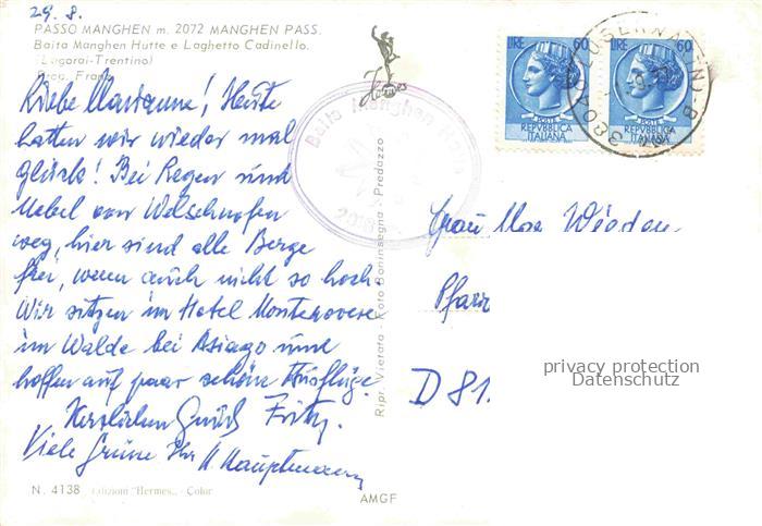 74079720 old postcard Passo Manghen Manghen Pass 2072m Trentino IT Baita Manghen Huette e Laghetto Cadinello postalisch gelaufen Erhaltung siehe scans [WerneD78] KatCode: 11240