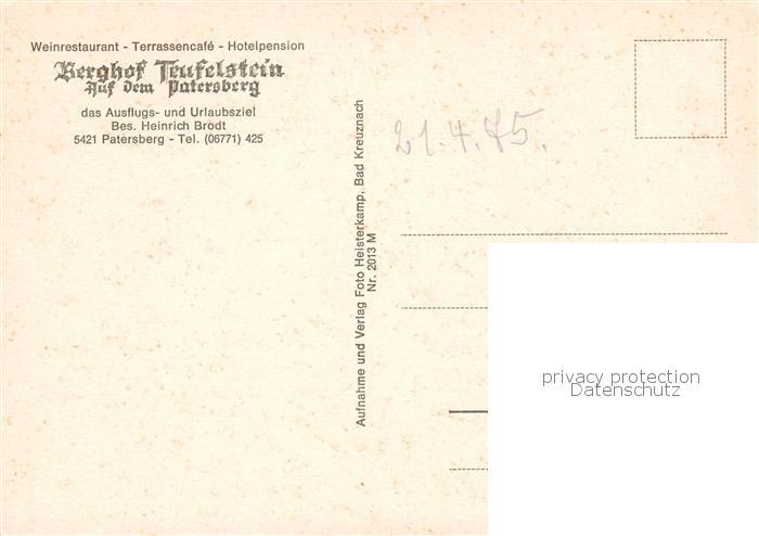 73844687 Patersberg Berghof Teufelstein auf dem Patersberg Weinrestaurant Terrassencafe Hotelpension postalisch nicht gelaufen Erhaltung siehe scans [WerneD78] KatCode: 11110007141109