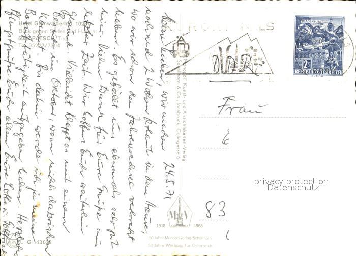 72515946 alte Postkarte Patsch Hotel Gruenwalderhof postalisch gelaufen Erhaltung siehe scans KatCode: 11390332070338