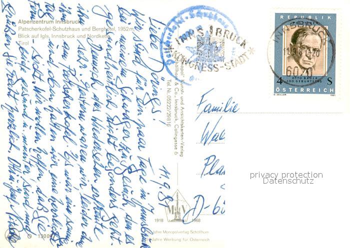 73304498 alte Postkarte Patscherkofel Haus Alpenzentrum Innsbruck Berghotel Fernsicht Blick auf Igls Nordkette postalisch gelaufen Erhaltung siehe scans [FriedD77] KatCode: 11390332070101