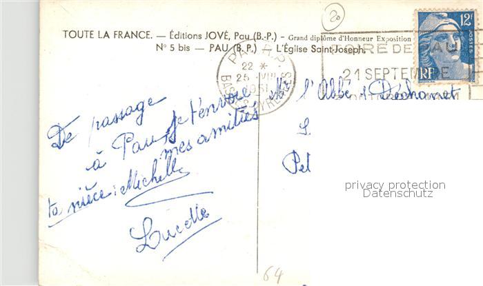 13529834 carte postale Pau 64 Eglise Saint-Joseph postalisch gelaufen Erhaltung siehe scans [LiesaD40] KatCode: 11170064364445