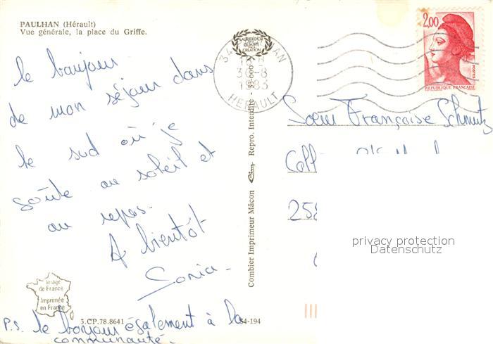 13266679 carte postale Paulhan Vue generale aerienne la place du Griffe postalisch gelaufen Erhaltung siehe scans [WerneD78] KatCode: 11170034234194