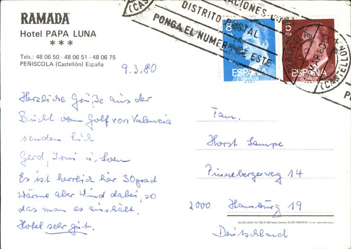 old postcard Peniscola Hotel Ramada Papa Luna postalisch gelaufen Erhaltung siehe scans