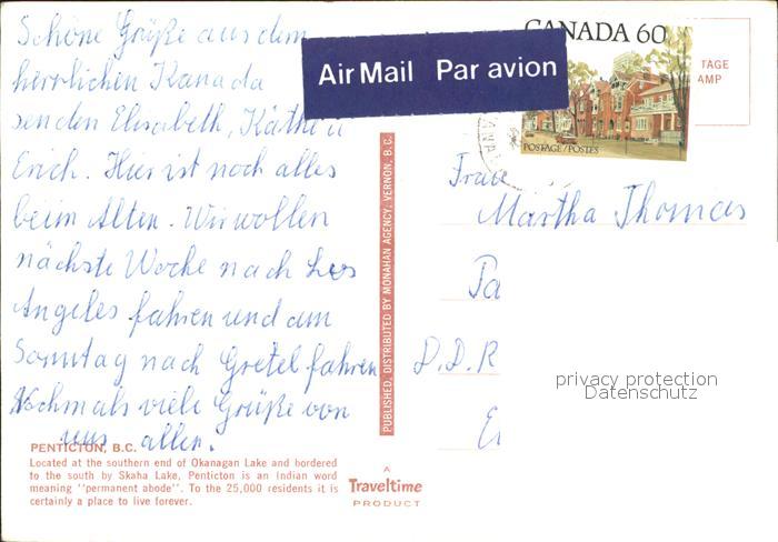 old postcard Penticton Okanagan Lake Skaha Lake Fliegeraufnahme postalisch gelaufen Erhaltung siehe scans