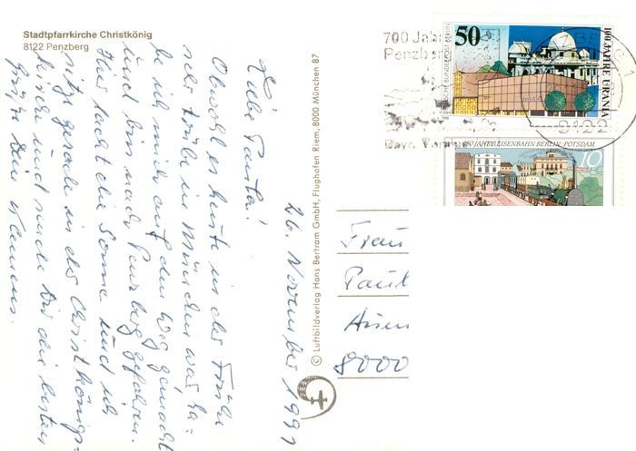 73878918 alte Postkarte Penzberg Stadtpfarrkirche Christkoenig Fliegeraufnahme postalisch gelaufen Erhaltung siehe scans [WerneD78] KatCode: 11110009190141