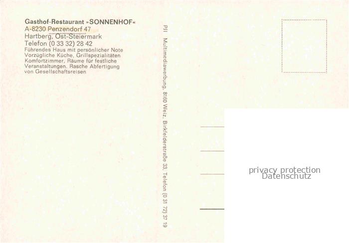 74132594 Penzendorf Neudorf Hartberg Steiermark AT Gasthof Restaurant Sonnenhof Storchennest Scheune Landschaftspanorama postalisch nicht gelaufen Erhaltung siehe scans [FriedD77] KatCode: 11390224060710