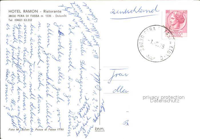 old postcard Pera di Fassa Hotel Ramon Ristorante Dolomiten postalisch gelaufen Erhaltung siehe scans