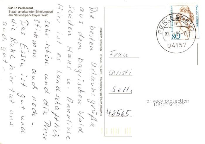 73251744 alte Postkarte Perlesreut Panorama Baederzentrum Rathaus Altes Waldlerhaus postalisch gelaufen Erhaltung siehe scans [KathaD81] KatCode: 11110009272138