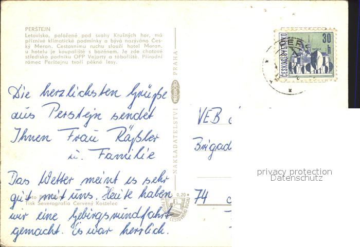 old postcard Perstejn Puerstein Hotel Ferienhaus Schwimmbad Camping Landschaft postalisch gelaufen Erhaltung siehe scans