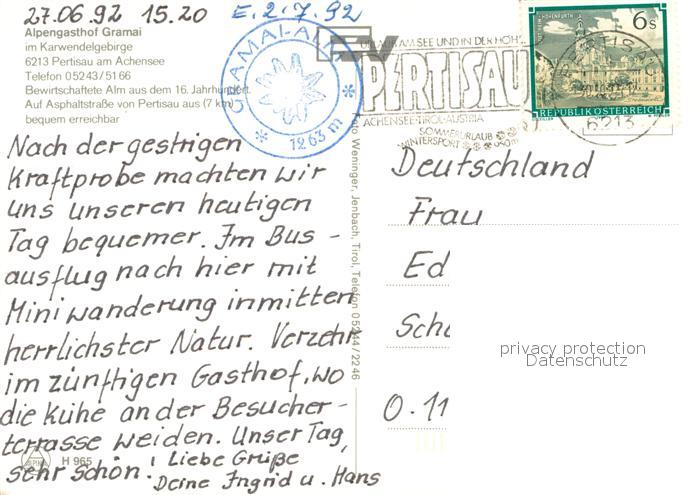 73643423 alte Postkarte Pertisau Achensee Alpengasthof Gramai Almwirtschaft Panorama postalisch gelaufen Erhaltung siehe scans [WerneD78] KatCode: 11390335070907