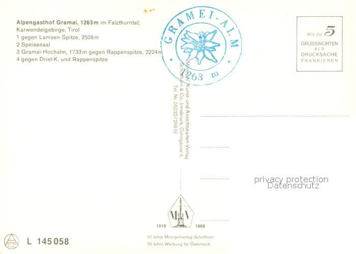 73270275 Pertisau Achensee Alpengasthof Gramai Falzthurntal Lamsen-Spitze Rappenspitze postalisch nicht gelaufen Erhaltung siehe scans [PaolaD17] KatCode: 11390335070907