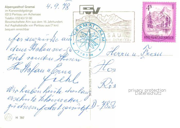 42622179 alte Postkarte Pertisau Achensee Alpengasthof Gramai Karwendel Viehweide postalisch gelaufen Erhaltung siehe scans [WerneD78] KatCode: 11390335070907