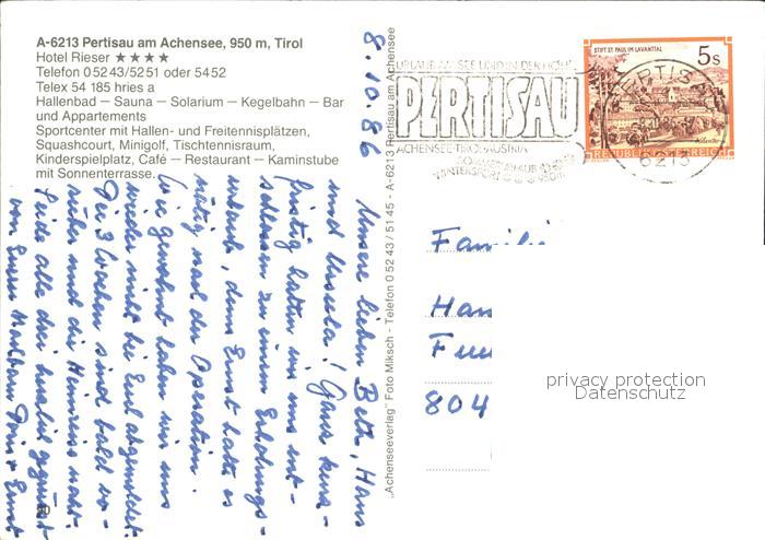 72220688 alte Postkarte Pertisau Achensee Hotel Restaurant Rieser Sportcenter Strand Dampflokomotive Kuehe Alpenblick Windsurfen postalisch gelaufen Erhaltung siehe scans KatCode: 11390335070907