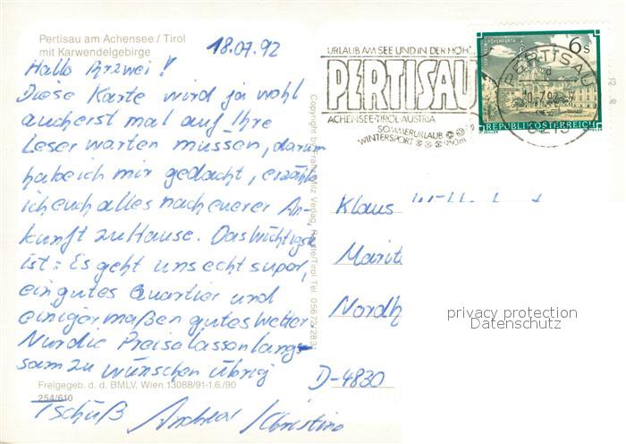 73644479 alte Postkarte Pertisau Achensee mit Karwendelgebirge Fliegeraufnahme postalisch gelaufen Erhaltung siehe scans [FriedD77] KatCode: 11390335070907