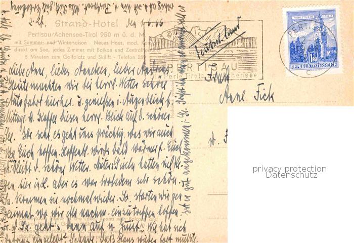 72725065 alte Postkarte Pertisau Achensee Strand Hotel Terrasse Gastraeume postalisch gelaufen Erhaltung siehe scans [WerneD78] KatCode: 11390335070907