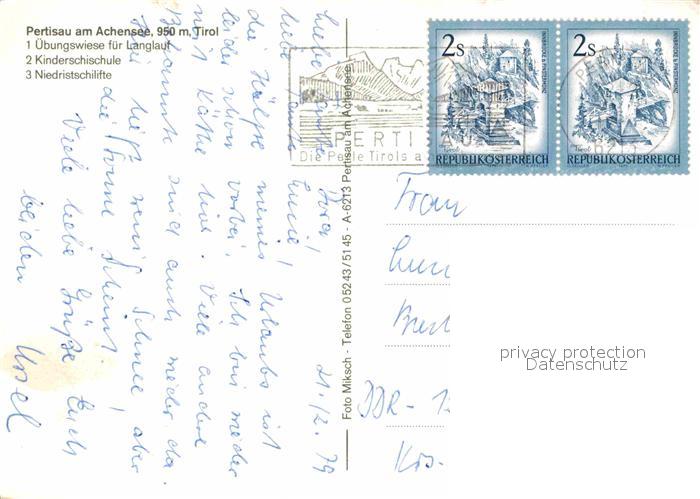 72773518 alte Postkarte Pertisau Achensee Wintersportplatz Langlaufzentrum Kinderschischule Schilifte postalisch gelaufen Erhaltung siehe scans [FriedD77] KatCode: 11390335070907