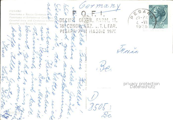 old postcard Pesaro Panorama e Rocca Costanza Skulptur postalisch gelaufen Erhaltung siehe scans