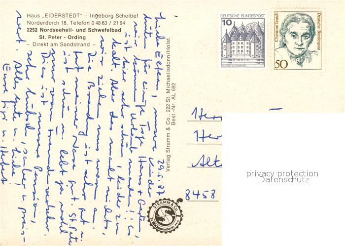 73160325 alte Postkarte Peter-Ording St Gaestehaus Eiderstedt Strand postalisch gelaufen Erhaltung siehe scans [KathaD81] KatCode: 11110001054113