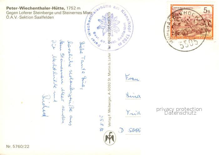 73649418 alte Postkarte Peter Wiechenthaler Huette mit Loferer Steinberge und Steinernes Meer postalisch gelaufen Erhaltung siehe scans [WerneD78] KatCode: 11390322050619