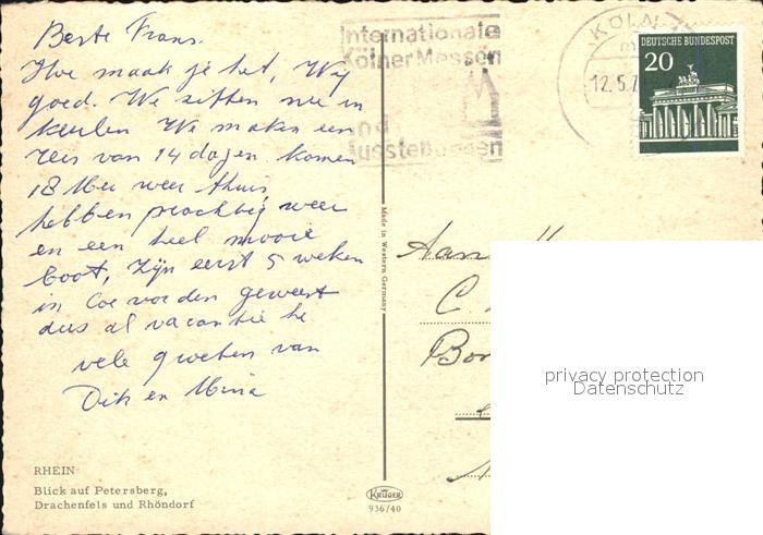 72603713 alte Postkarte Petersberg Koenigswinter Blick ueber den Rhein Drachenfels Rhoendorf postalisch gelaufen Erhaltung siehe scans [FriedD77] KatCode: 11110005382024