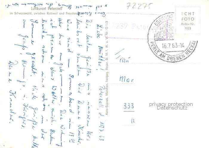 73855412 alte Postkarte Peterzell Alpirsbach Luftkurort im Schwarzwald postalisch gelaufen Fliegeraufnahme Erhaltung siehe scans [FriedD77] KatCode: 11110008237002