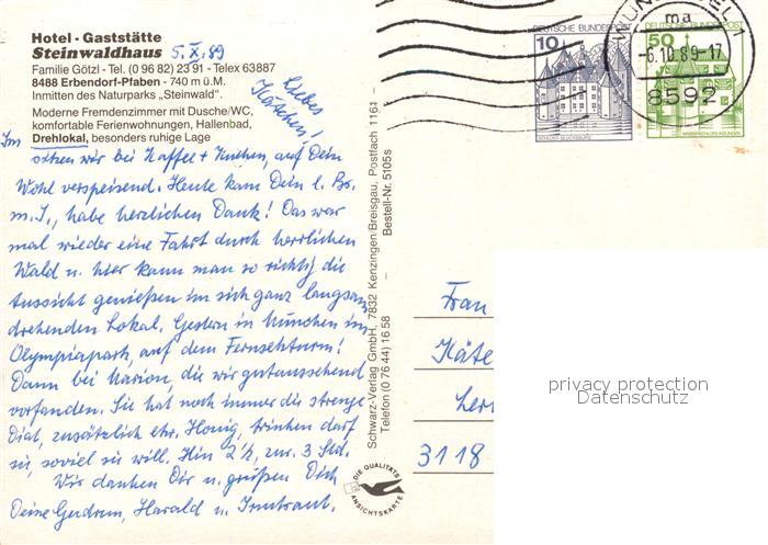 73040866 alte Postkarte Pfaben Hotel Gaststaette Steinwaldhaus Drehlokal postalisch gelaufen Erhaltung siehe scans [FriedD77] KatCode: 11110009377116