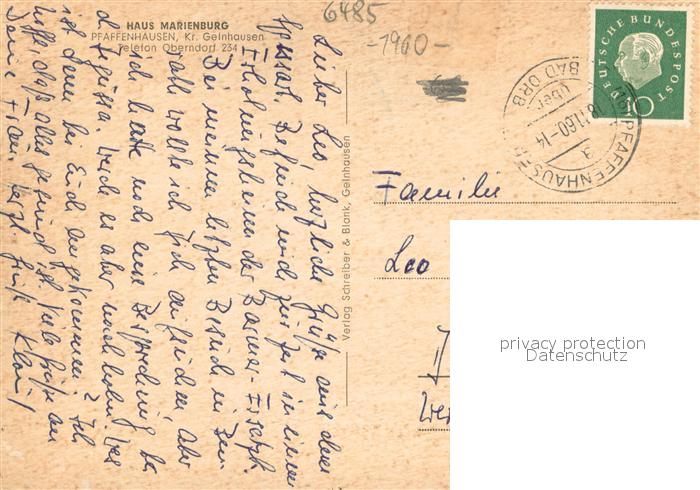 73699021 alte Postkarte Pfaffenhausen Spessart Haus Marienburg postalisch gelaufen Erhaltung siehe scans [FriedD77] KatCode: 11110006435016
