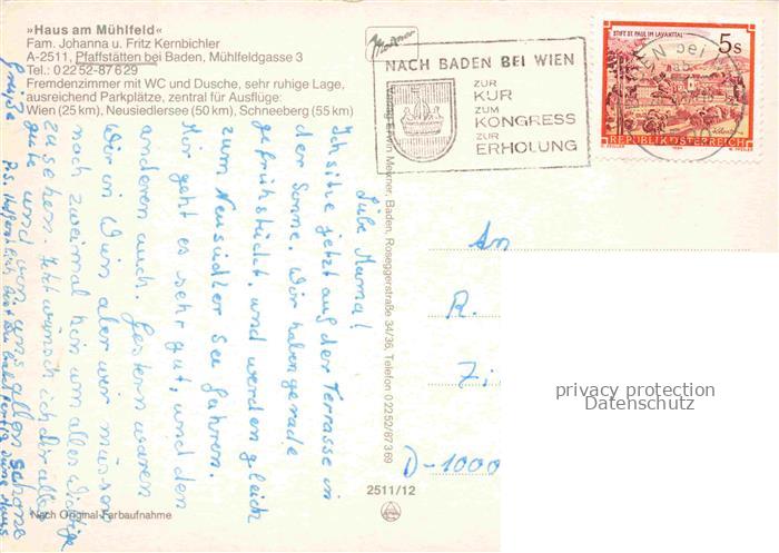 74109900 alte Postkarte Pfaffstaetten Baden Wiener Sueden Niederoesterreich AT Haus am Muehlfeld Gastraum Balkon Weg postalisch gelaufen Erhaltung siehe scans [WerneD78] KatCode: 11390127030625