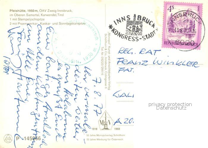 73285169 alte Postkarte Pfeishuette Stempeljochspitze Praxmarerkarspitze postalisch gelaufen Erhaltung siehe scans [NatalD47] KatCode: 11390332070101