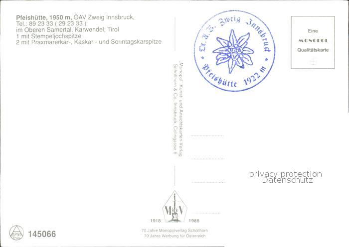 72562454 Pfeishuette Zweig Innsbruck Karwendel Kaskar postalisch nicht gelaufen Erhaltung siehe scans [AntonD74] KatCode: 11390332070101
