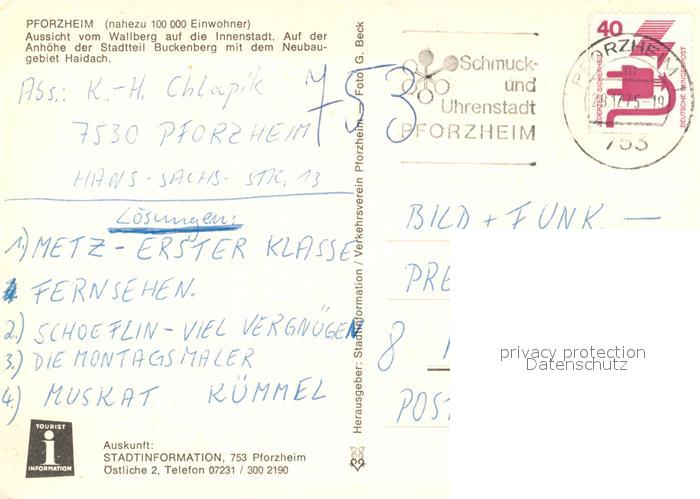 73163454 alte Postkarte Pforzheim Blick vom Wallberg auf die Innenstadt postalisch gelaufen Erhaltung siehe scans [WerneD78] KatCode: 11110008231000