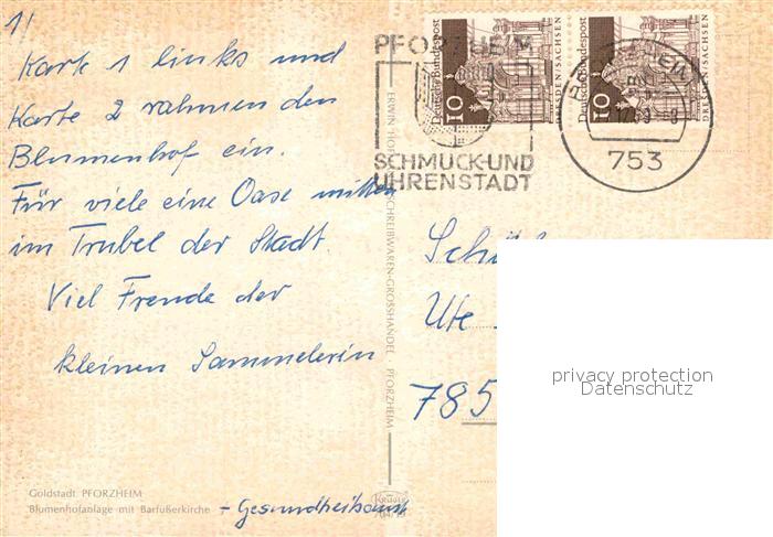 72725707 alte Postkarte Pforzheim Goldstadt Blumenhofanlage mit Barfuesserkirche postalisch gelaufen Erhaltung siehe scans [LiesaD40] KatCode: 11110008231000