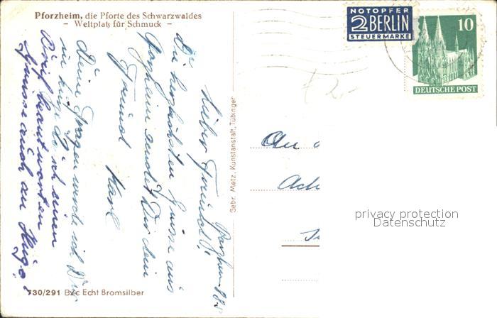 72253077 alte Postkarte Pforzheim Leopoldplatz Marktplatz Rathaus Enzpartie Gewerbeschule Stadtbad postalisch gelaufen Erhaltung siehe scans KatCode: 11110008231000
