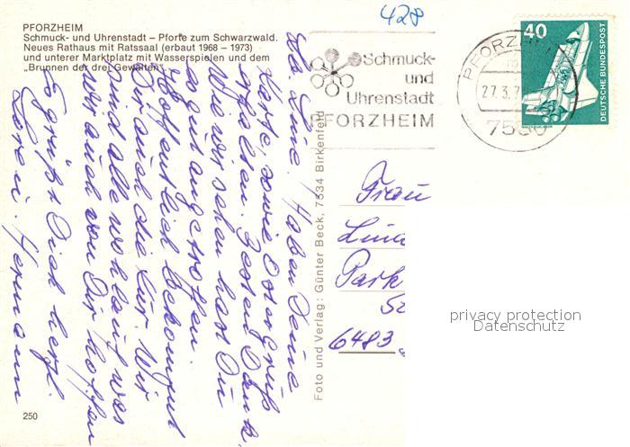72929621 alte Postkarte Pforzheim Neues Rathaus Marktplatz Wasserspiele Brunnen drei Gewalten postalisch gelaufen Erhaltung siehe scans [KathaD81] KatCode: 11110008231000