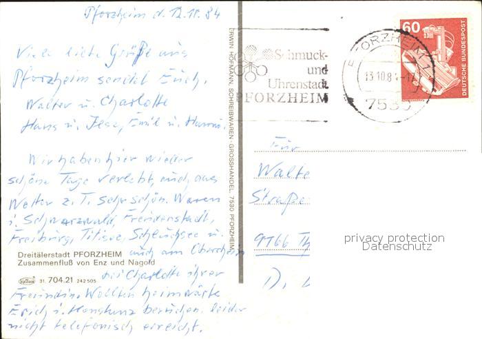 72450619 alte Postkarte Pforzheim Zusmmenfluss von Enz und Nagold mit Kirche postalisch gelaufen Erhaltung siehe scans KatCode: 11110008231000