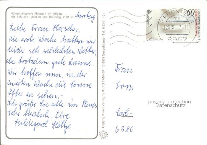 alte Postkarte Pfronten Ortsansicht mit Kirche Baumbluete Schlicke Rossberg Allgaeuer Alpen postalisch gelaufen Erhaltung siehe scans