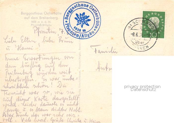 72961400 alte Postkarte Pfronten Ostallgaeu Bayern Berggasthaus Ostlerhuette Breitenberg postalisch gelaufen Erhaltung siehe scans [PaolaD17] KatCode: 11110009777159
