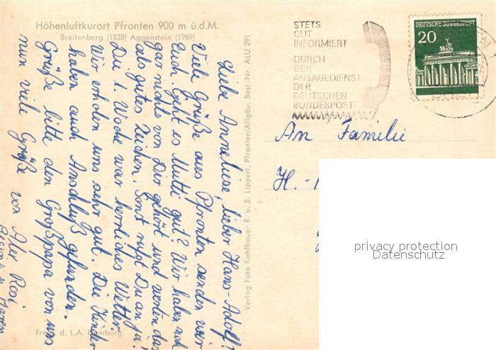 73227602 alte Postkarte Pfronten Ostallgaeu Bayern Breitenberg Aggenstein postalisch gelaufen Erhaltung siehe scans [NatalD47] KatCode: 11110009777159