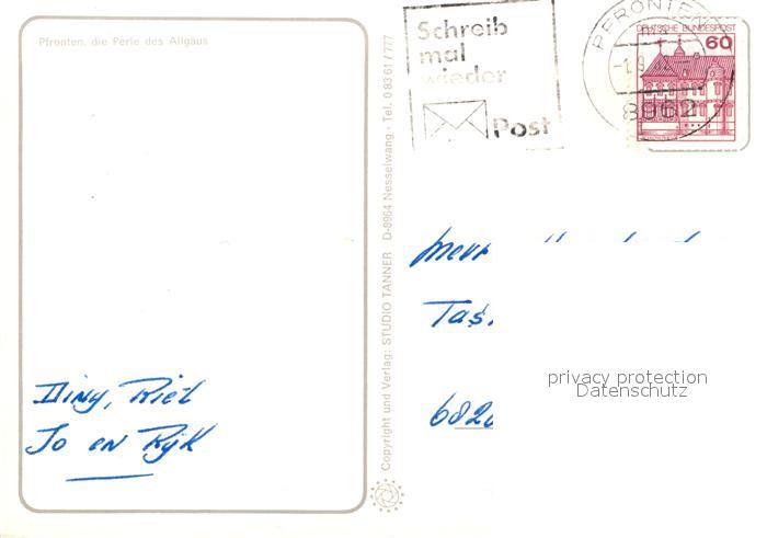 72934720 alte Postkarte Pfronten Ostallgaeu Bayern Gesamtansicht mit Alpenpanorama Zugspitze Aggenstein Sorgschrofen Kienberg Achtal Schlossanger Alm Hochalm Freibad postalisch gelaufen Erhaltung siehe scans [FriedD77] KatCode: 11110009777159