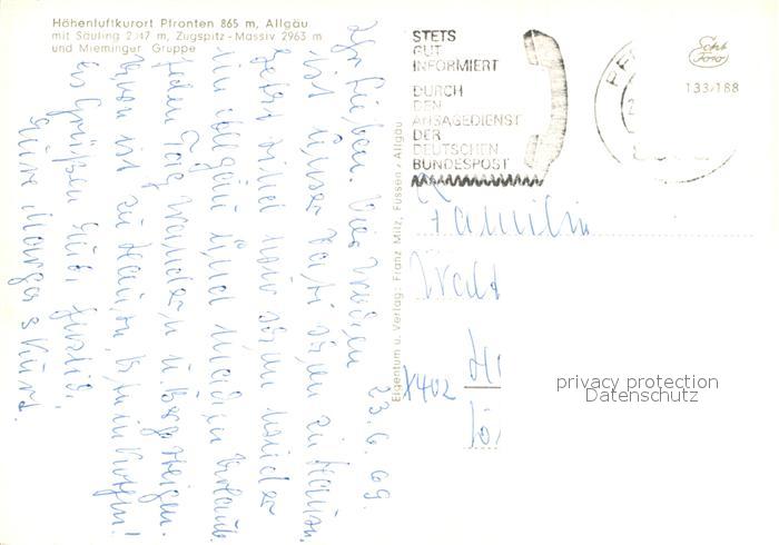 72952831 alte Postkarte Pfronten Ostallgaeu Bayern Gesamtansicht mit Zugspitz Massiv und Mieminger Gruppe postalisch gelaufen Erhaltung siehe scans [FriedD77] KatCode: 11110009777159