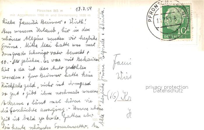 73248443 alte Postkarte Pfronten Ostallgaeu Bayern mit Aggenstein und Breitenberg postalisch gelaufen Erhaltung siehe scans [WerneD78] KatCode: 11110009777159