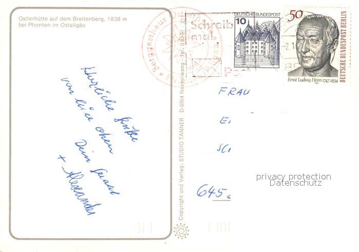 73065264 alte Postkarte Pfronten Ostallgaeu Bayern Ostlerhuette am Breitenberg Alpenpanorama Edelweiss postalisch gelaufen Erhaltung siehe scans [FriedD77] KatCode: 11110009777159