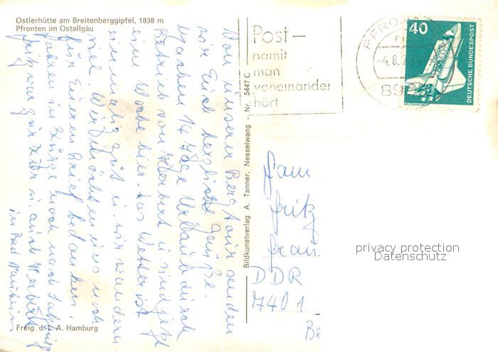 73705373 alte Postkarte Pfronten Ostallgaeu Bayern Ostlerhuette am Breitenberggipfel Allgaeuer Alpen postalisch gelaufen Fliegeraufnahme Erhaltung siehe scans [FriedD77] KatCode: 11110009777159