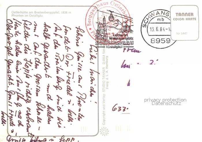 72865445 alte Postkarte Pfronten Ostallgaeu Bayern Ostlerhuette am Breitenberggipfel Alpenpanorama Fliegeraufnahme postalisch gelaufen Erhaltung siehe scans [FriedD77] KatCode: 11110009777159