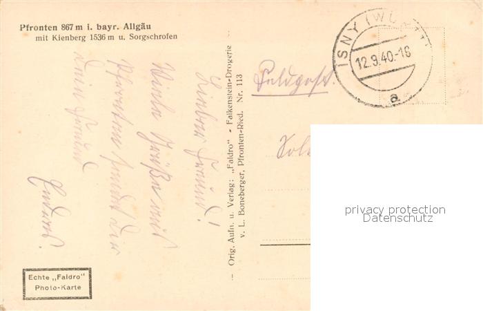 73530922 alte Postkarte Pfronten Ostallgaeu Bayern Panorama mit Kienberg und Sorgschrofen Allgaeuer Alpen postalisch gelaufen Feldpostkarte Erhaltung siehe scans [FriedD77] KatCode: 11110009777159