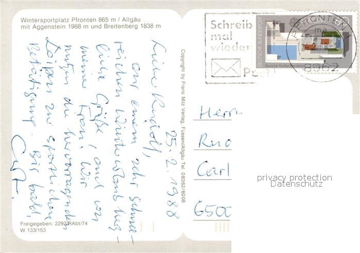 73080464 alte Postkarte Pfronten Ostallgaeu Bayern Wintersportplatz mit Aggenstein Breitenberg Allgaeuer Alpen Fliegeraufnahme postalisch gelaufen Erhaltung siehe scans [FriedD77] KatCode: 11110009777159